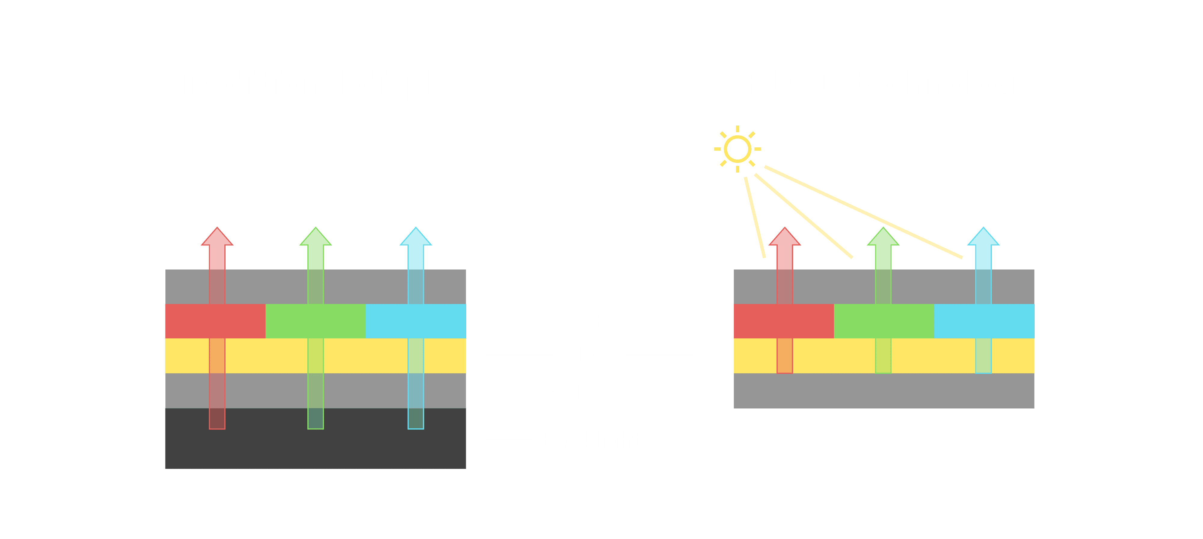 与传统需搭配背光单元的液晶显示相比,,,反射式液晶技术不仅更省电、、更轻薄,,,,且即便在艳阳下仍能清晰显示。。此外,,少了背光单元,,,也大幅降低了 LED 蓝光伤害眼睛的疑虑。。