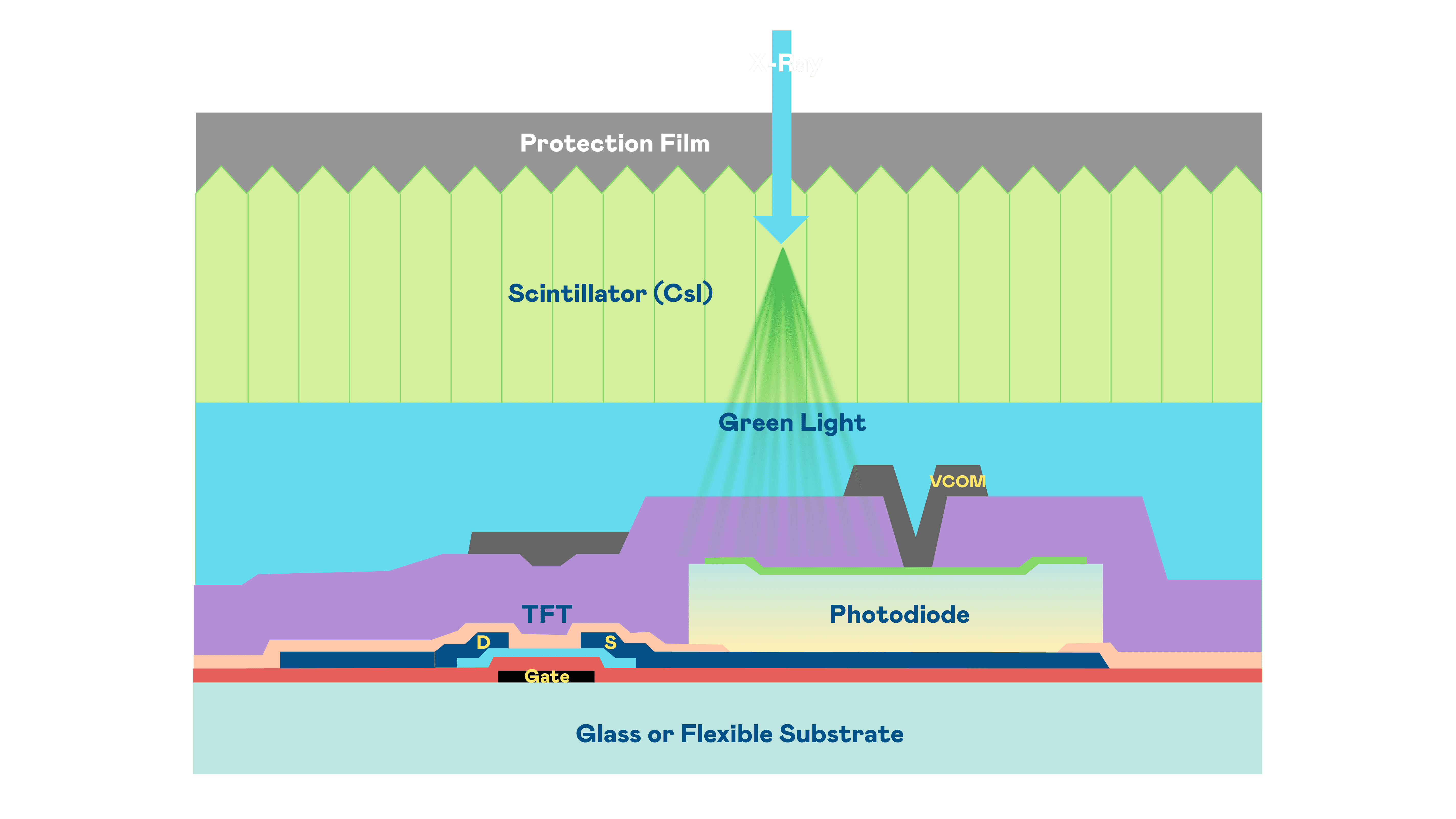 尊龙集团的X光影像感测阵列使用薄膜电晶体 (TFT) 作为每个像素的读取开关,,搭配光电二极体(Photodiode)的光电转换元件,,,,用以感测X光影像讯号。。。